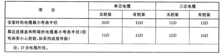 根據(jù)GB 50054-95低壓配電設(shè)計規(guī)范中第5.6.39條,電纜敷設(shè)的彎曲半徑與電纜外徑的比值,不應(yīng)小于表3的規(guī)定。